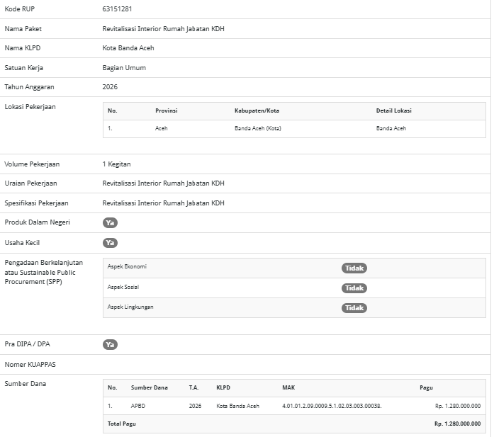 Informasi mengenai revitalisasi interior rumah jabatan Walikota Banda Aceh yang tercantum dalam sirup.inaproc.id