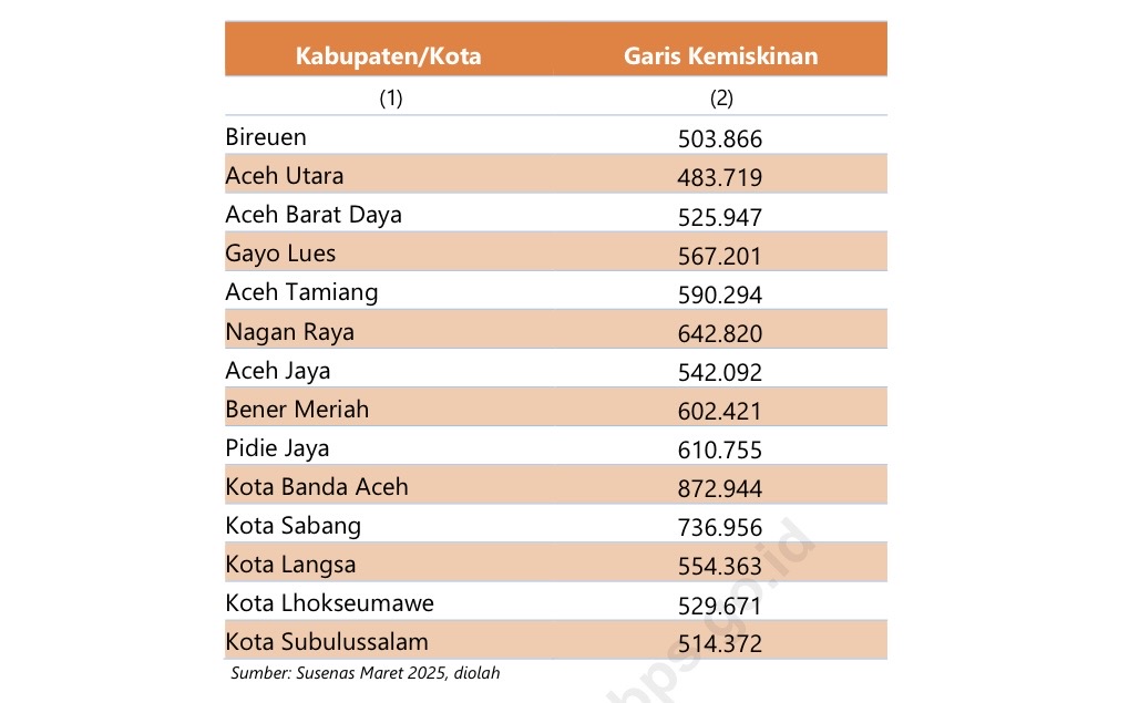 Dalam laporan publikasi Profil Kemiskinan Provinsi Aceh Tahun 2025, yang disusun berdasarkan hasil Survei Sosial Ekonomi Nasional (Susenas) Maret 2025.