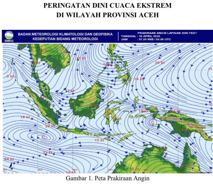 Berdasarkan hasil pemantauan prakiraan angin pada lapisan 3.000 kaki, area shearline dan konvergensi terdeteksi melintasi wilayah Aceh, sehingga meningkatkan peluang terjadinya cuaca ekstrem dalam beberapa hari ke depan.