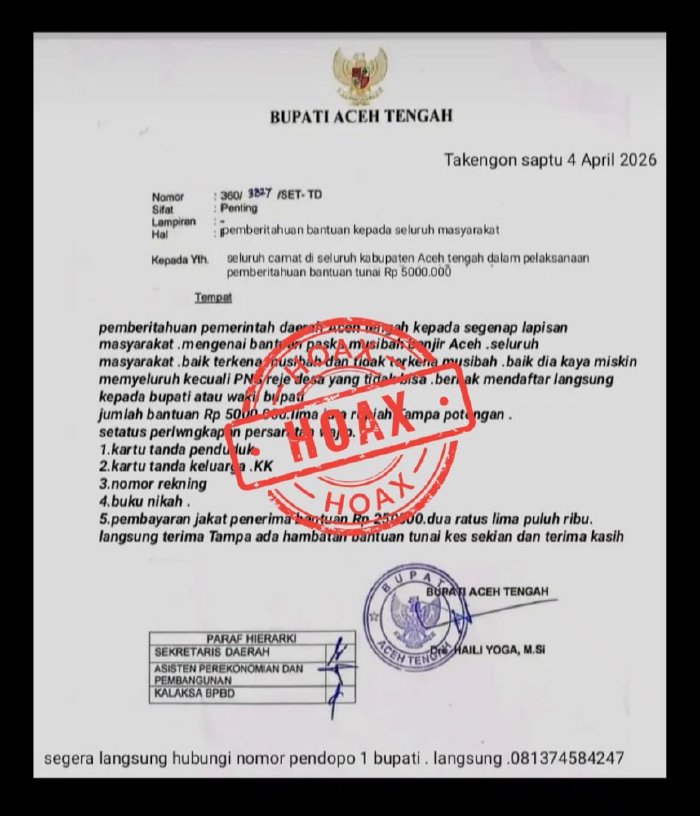 “Surat yang beredar tertanggal (4/4/2026) tersebut bukan dikeluarkan oleh Pemerintah Kabupaten Aceh Tengah. Kami minta masyarakat tidak menyebarluaskan informasi yang belum jelas kebenarannya,” kata Mustafa dikutip dari laman Pemkab Aceh Tengah.